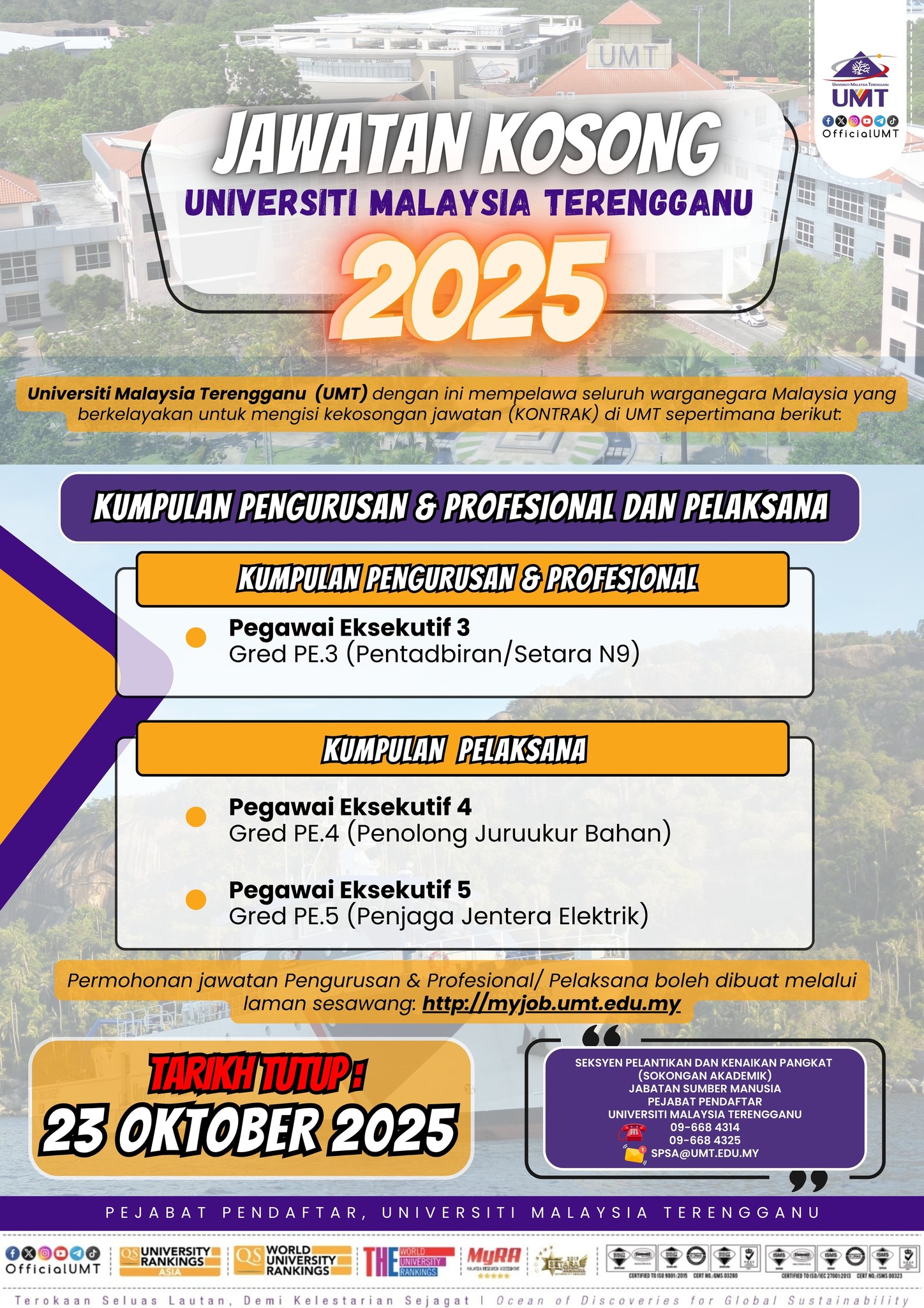 Iklan Kini Jawatan Kosong Universiti Malaysia Terengganu (UMT) Like serta Ikut Facebook Kami, follow Chanel WhatsApp Jawatan Kosong & Telegram Portal SPA9 untuk capaian pantas kekosongan jawatan daripada kami sekarang. Klik Iklan Jawatan