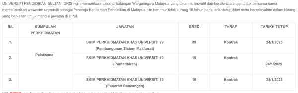 Iklan Kini Jawatan Kosong Universiti Pendidikan Sultan Idris (UPSI) Klik Iklan Jawatan Like serta Ikut Facebook Kami, follow Chanel WhatsApp Jawatan Kosong & Telegram Portal SPA9 untuk capaian pantas kekosongan jawatan daripada kami sekarang.