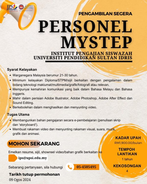 Iklan Kini Jawatan Kosong Universiti Pendidikan Sultan Idris (UPSI) Like serta Ikut Facebook Kami, follow Chanel WhatsApp Jawatan Kosong & Telegram Portal SPA9 untuk capaian pantas kekosongan jawatan daripada kami sekarang. Klik Jawatan Disini