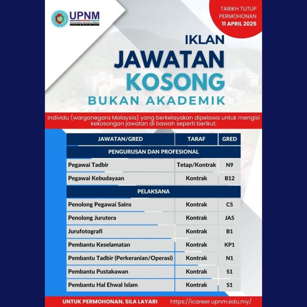 Iklan Kini Jawatan Kosong Universiti Pertahanan Nasional Malaysia (UPNM) Like serta Ikut Facebook Kami, follow Chanel WhatsApp Jawatan Kosong & Telegram Portal SPA9 untuk capaian pantas kekosongan jawatan daripada kami sekarang. Klik Jawatan Disini