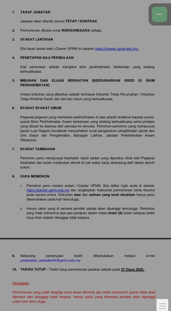 Iklan Kini Jawatan Kosong Universiti Pertahanan Nasional Malaysia (UPNM) Like serta Ikut Facebook Kami, follow Chanel WhatsApp Jawatan Kosong & Telegram Portal SPA9 untuk capaian pantas kekosongan jawatan daripada kami sekarang. Klik Jawatan Disini