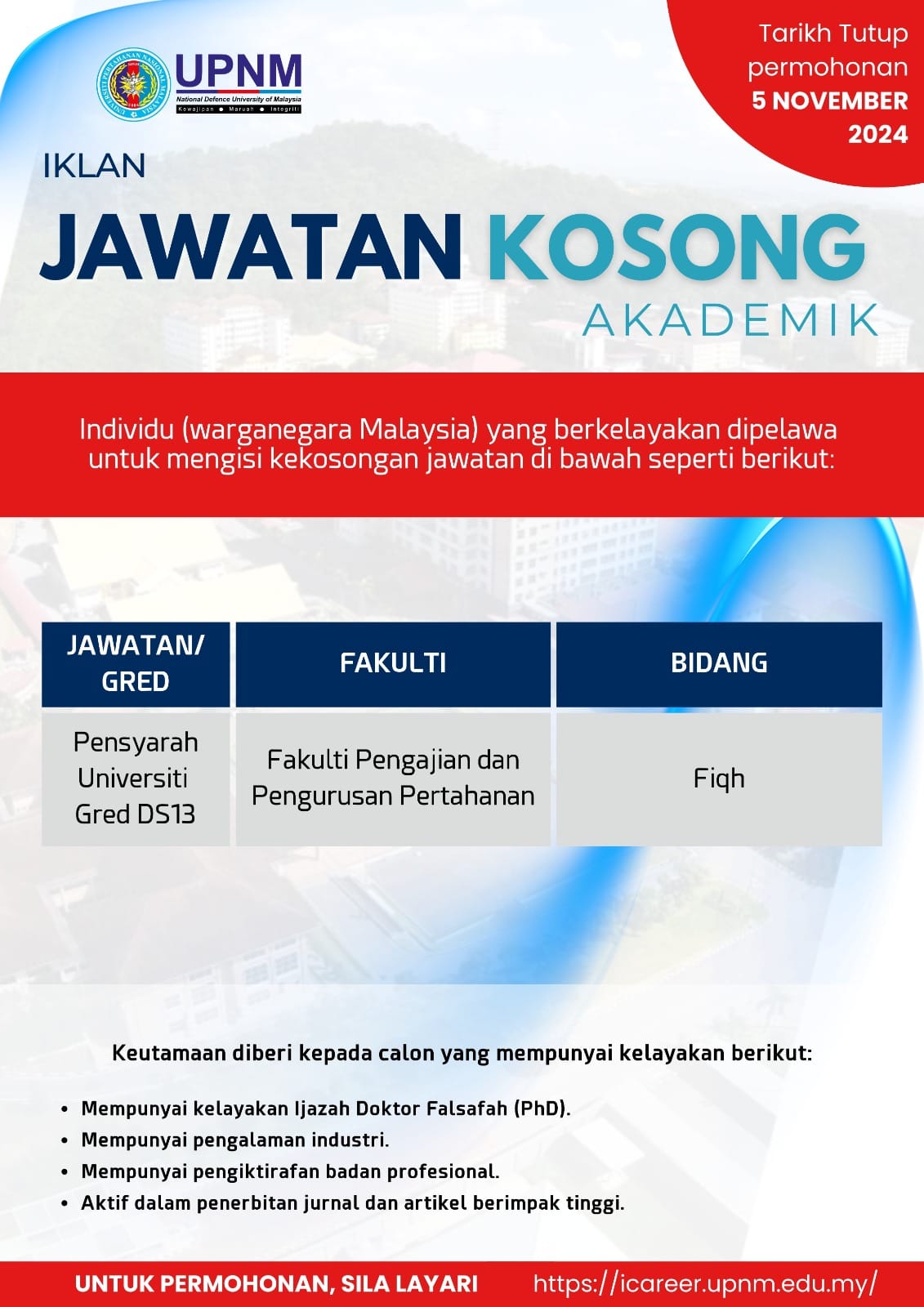 Iklan Kini Jawatan Kosong Universiti Pertahanan Nasional Malaysia (UPNM) Like serta Ikut Facebook Kami, follow Chanel WhatsApp Jawatan Kosong & Telegram Portal SPA9 untuk capaian pantas kekosongan jawatan daripada kami sekarang. Klik Jawatan Disini