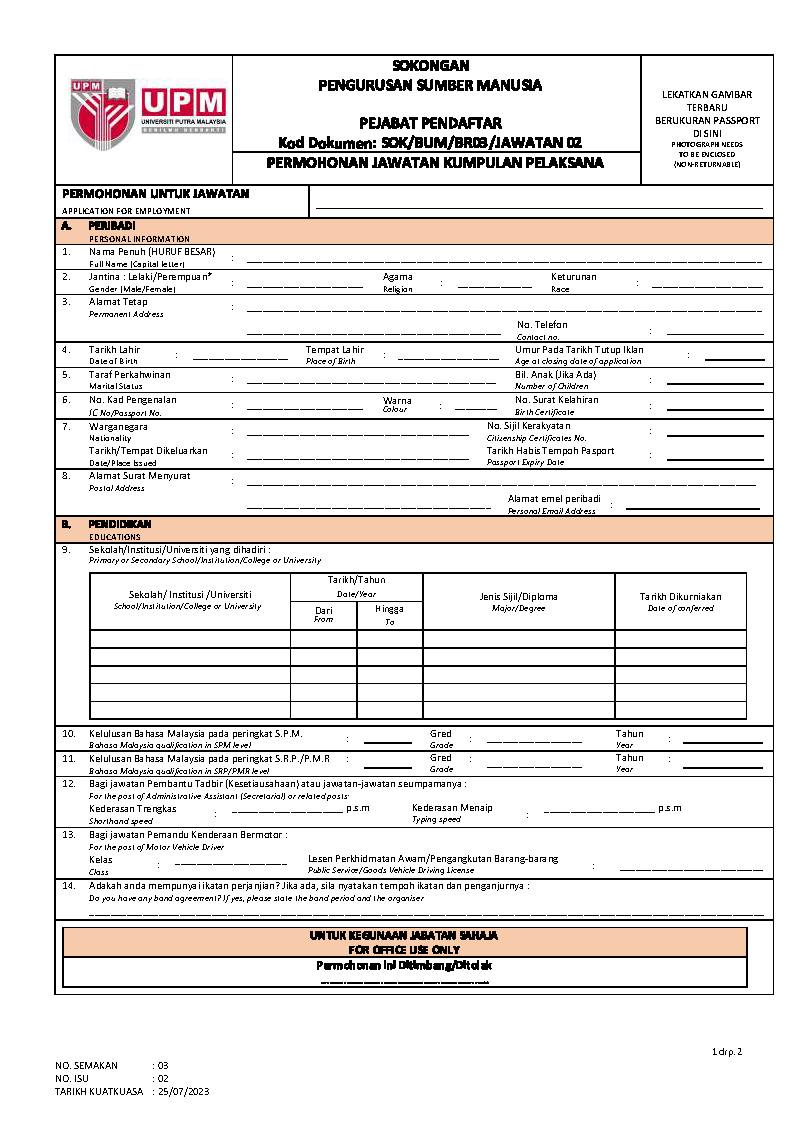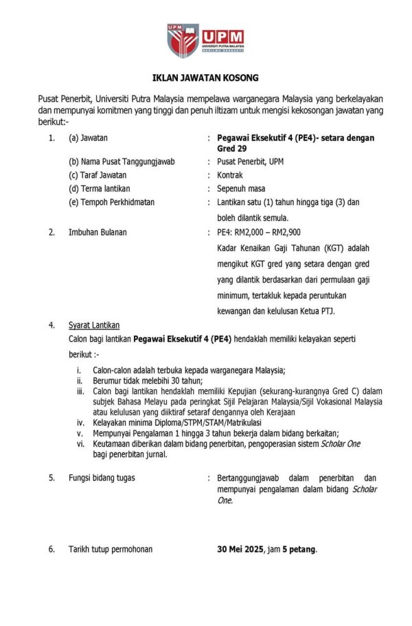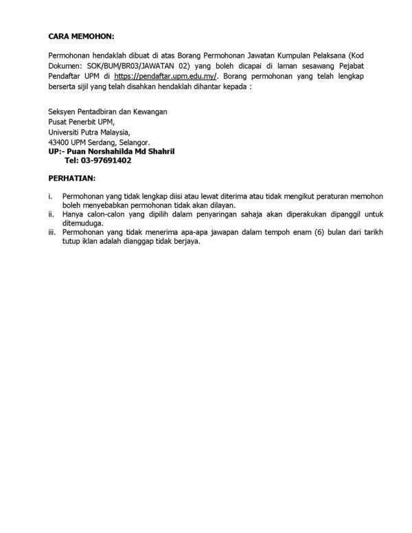 Iklan Kini Jawatan Kosong Universiti Putra Malaysia (UPM) Like serta Ikut Facebook Kami, follow Chanel WhatsApp Jawatan Kosong & Telegram Portal SPA9 untuk capaian pantas kekosongan jawatan daripada kami sekarang.