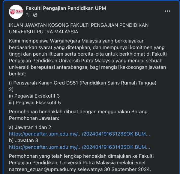 Iklan Kini Jawatan Kosong Universiti Putra Malaysia (UPM) Like serta Ikut Facebook Kami, follow Chanel WhatsApp Jawatan Kosong & Telegram Portal SPA9 untuk capaian pantas kekosongan jawatan daripada kami sekarang.