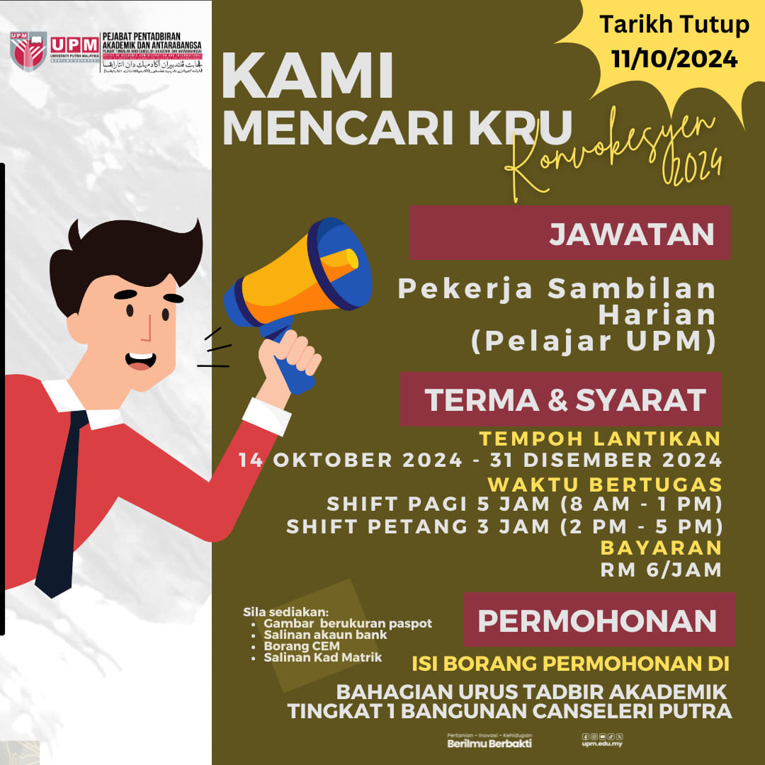 Iklan Kini Jawatan Kosong Universiti Putra Malaysia (UPM) Like serta Ikut Facebook Kami, follow Chanel WhatsApp Jawatan Kosong & Telegram Portal SPA9 untuk capaian pantas kekosongan jawatan daripada kami sekarang. Kilik Jawatan Disini