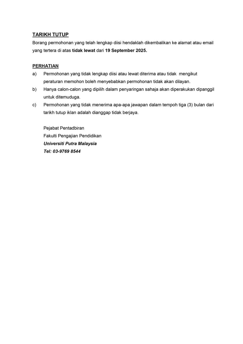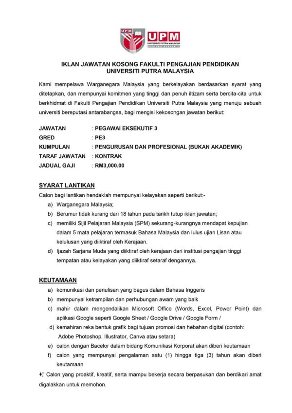 Iklan Kini Jawatan Kosong Universiti Putra Malaysia Like serta Ikut Facebook Kami, follow Chanel WhatsApp Jawatan Kosong & Telegram Portal SPA9 untuk capaian pantas kekosongan jawatan daripada kami sekarang. Klik Iklan Disini