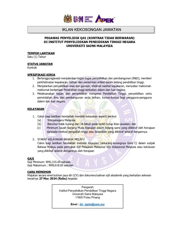 Iklan Kini Jawatan Kosong Universiti Sains Malaysia (USM) Like serta Ikut Facebook Kami, follow Chanel WhatsApp Jawatan Kosong & Telegram Portal SPA9 untuk capaian pantas kekosongan jawatan daripada kami sekarang.