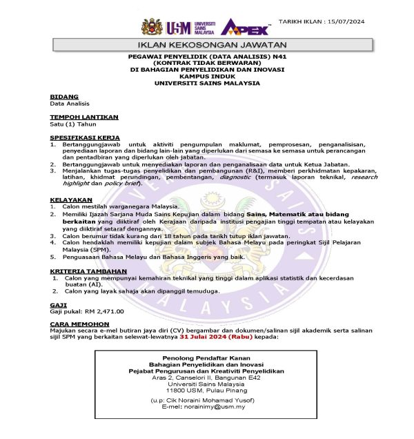 Iklan Kini Jawatan Kosong Universiti Sains Malaysia (USM) Like serta Ikut Facebook Kami, follow Chanel WhatsApp Jawatan Kosong & Telegram Portal SPA9 untuk capaian pantas kekosongan jawatan daripada kami sekarang. Klik Jawatan Disini