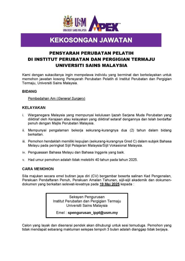Iklan Kini Jawatan Kosong Universiti Sains Malaysia (USM) Like serta Ikut Facebook Kami, follow Chanel WhatsApp Jawatan Kosong & Telegram Portal SPA9 untuk capaian pantas kekosongan jawatan daripada kami sekarang. Klik Jawatan Disini