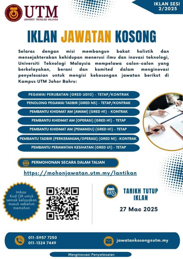 Iklan Kini Jawatan Kosong Universiti Teknologi Malaysia (UTM) Klik Iklan Disini Like serta Ikut Facebook Kami, follow Chanel WhatsApp Jawatan Kosong & Telegram Portal SPA9 untuk capaian pantas kekosongan jawatan daripada kami sekarang.