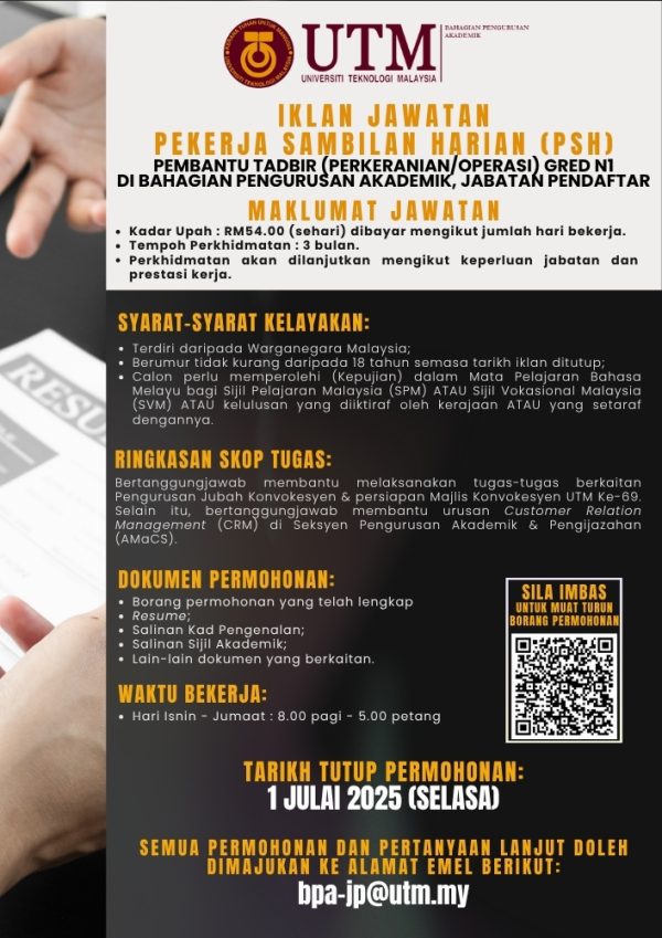 Iklan Kini Jawatan Kosong Universiti Teknologi Malaysia (UTM) Like serta Ikut Facebook Kami, follow Chanel WhatsApp Jawatan Kosong & Telegram Portal SPA9 untuk capaian pantas kekosongan jawatan daripada kami sekarang.