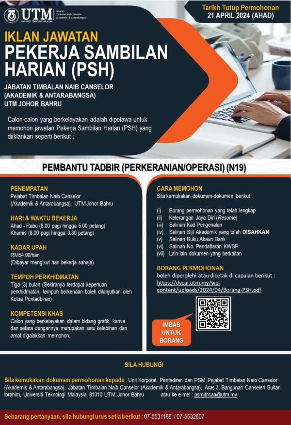 Iklan Kini Jawatan Kosong Universiti Teknologi Malaysia (UTM) Like serta Ikut Facebook Kami, follow Chanel WhatsApp Jawatan Kosong & Telegram Portal SPA9 untuk capaian pantas kekosongan jawatan daripada kami sekarang.