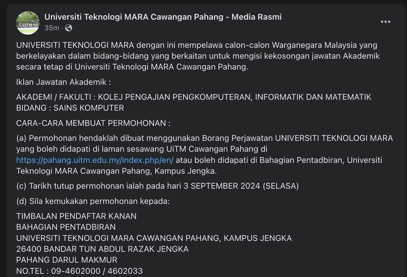 Iklan Kini Jawatan Kosong Universiti Teknologi Mara ~ Cawangan Pahang Like serta Ikut Facebook Kami, follow Chanel WhatsApp Jawatan Kosong & Telegram Portal SPA9 untuk capaian pantas kekosongan jawatan daripada kami sekarang. Klik Jawatan Disini