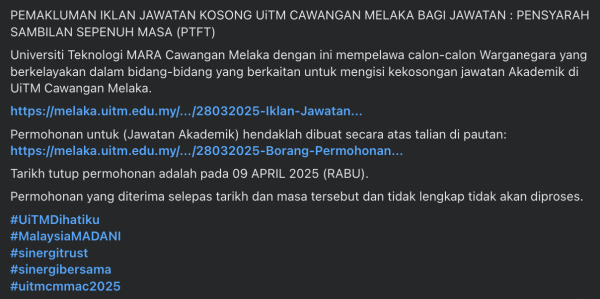 Iklan Kini Jawatan Kosong Universiti Teknologi Mara (UiTM) Cawangan Melaka Like serta Ikut Facebook Kami, follow Chanel WhatsApp Jawatan Kosong & Telegram Portal SPA9 untuk capaian pantas kekosongan jawatan daripada kami sekarang. Klik Jawatan Disini