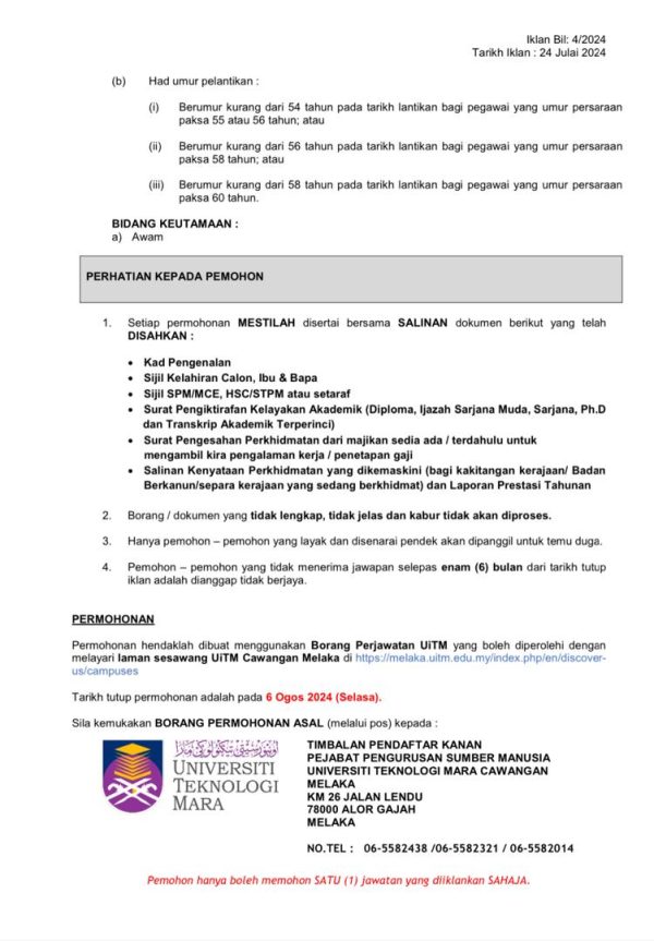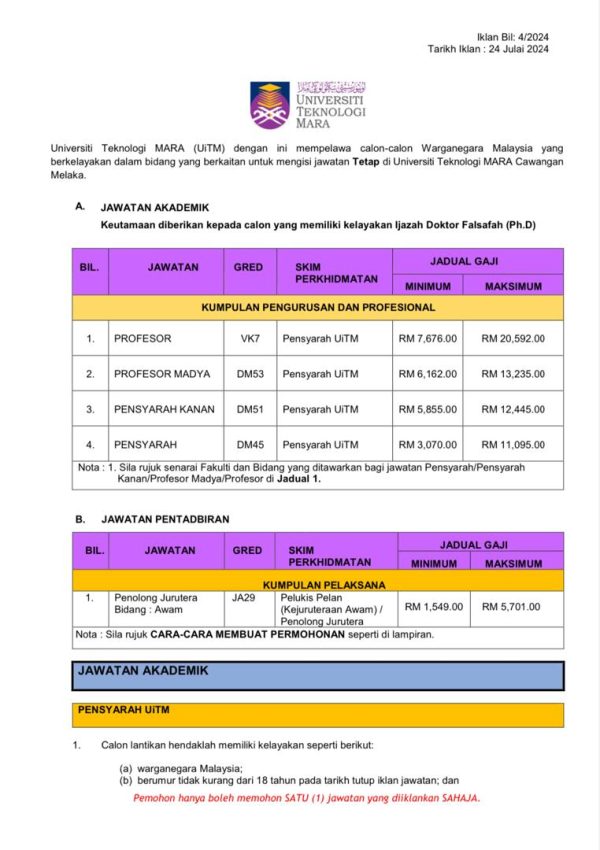 Iklan Kini Jawatan Kosong Universiti Teknologi MARA (UiTM) Cawangan Melaka Like serta Ikut Facebook Kami, follow Chanel WhatsApp Jawatan Kosong & Telegram Portal SPA9 untuk capaian pantas kekosongan jawatan daripada kami sekarang. Klik Jawatan Disini