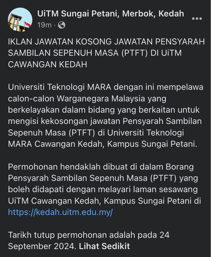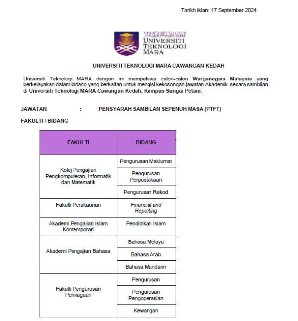 Iklan Kini Jawatan Kosong Universiti Teknologi MARA (UiTM) Cawangan Sungai Petani Like serta Ikut Facebook Kami, follow Chanel WhatsApp Jawatan Kosong & Telegram Portal SPA9 untuk capaian pantas kekosongan jawatan daripada kami sekarang.