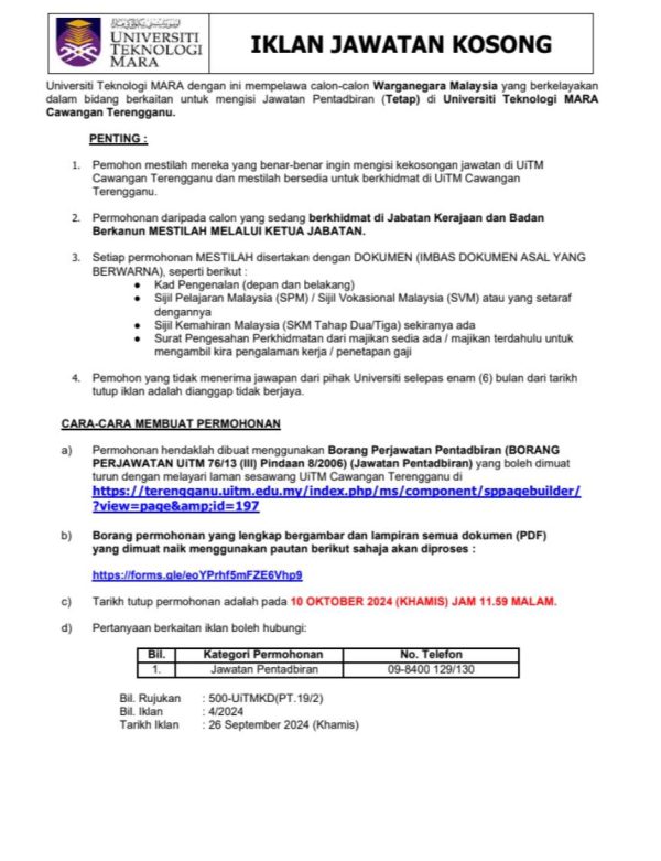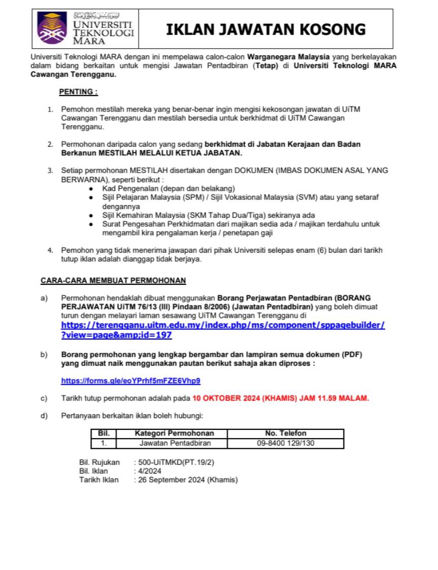 Iklan Kini Jawatan Kosong Universiti Teknologi Mara (UiTM) Cawangan Terengganu Klik Jawatan Disini Like serta Ikut Facebook Kami, follow Chanel WhatsApp Jawatan Kosong & Telegram Portal SPA9 untuk capaian pantas kekosongan jawatan daripada kami sekarang.