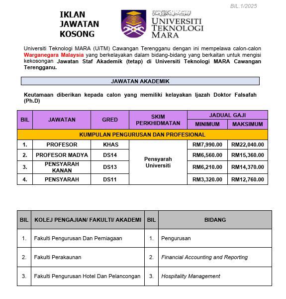 Iklan KIni Jawatan Kosong Universiti Teknologi Mara (UiTM) Cawangan Terengganu Klik Jawatan Disini Like serta Ikut Facebook Kami, follow Chanel WhatsApp Jawatan Kosong & Telegram Portal SPA9 untuk capaian pantas kekosongan jawatan daripada kami sekarang.