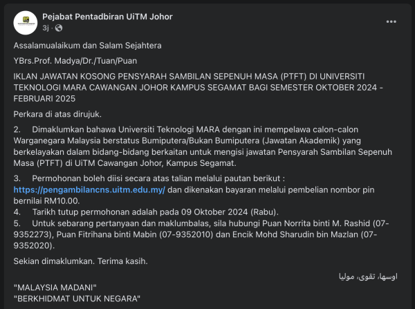 Iklan Kini Jawatan Kosong Universiti Teknologi MARA (UiTM) Johor Like serta Ikut Facebook Kami, follow Chanel WhatsApp Jawatan Kosong & Telegram Portal SPA9 untuk capaian pantas kekosongan jawatan daripada kami sekarang. Klik Jawatan Disini