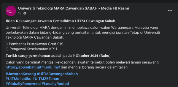 Iklan Kini Jawatan Kosong Universiti Teknologi MARA (UiTM) Sabah Like serta Ikut Facebook Kami, follow Chanel WhatsApp Jawatan Kosong & Telegram Portal SPA9 untuk capaian pantas kekosongan jawatan daripada kami sekarang. Klik Jawatan Disini