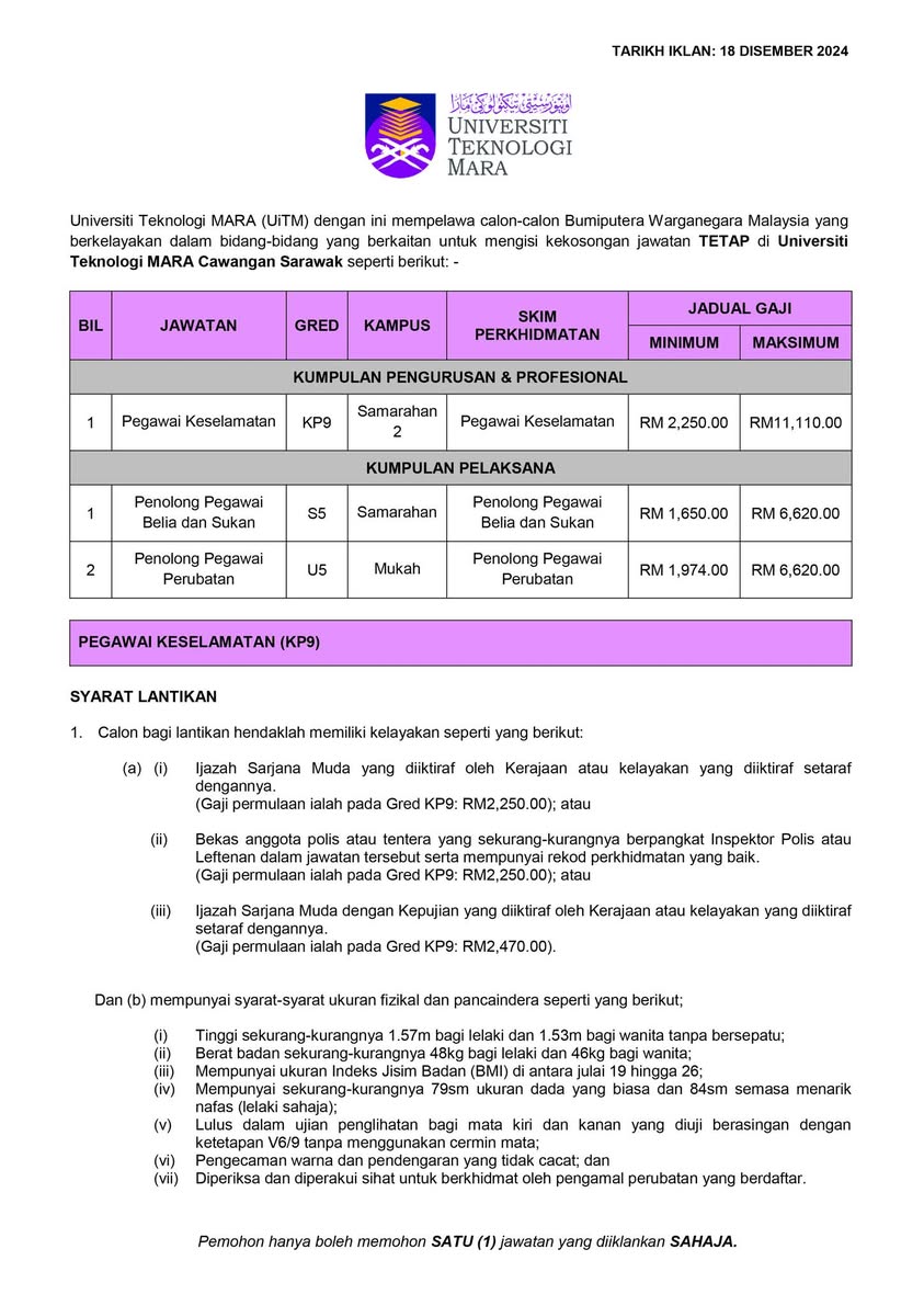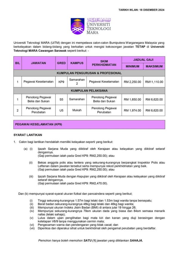 Iklan Kini Jawatan Kosong Universiti Teknologi Mara (UiTM) Sarawak Like serta Ikut Facebook Kami, follow Chanel WhatsApp Jawatan Kosong & Telegram Portal SPA9 untuk capaian pantas kekosongan jawatan daripada kami sekarang. Klik Iklan Jawatan