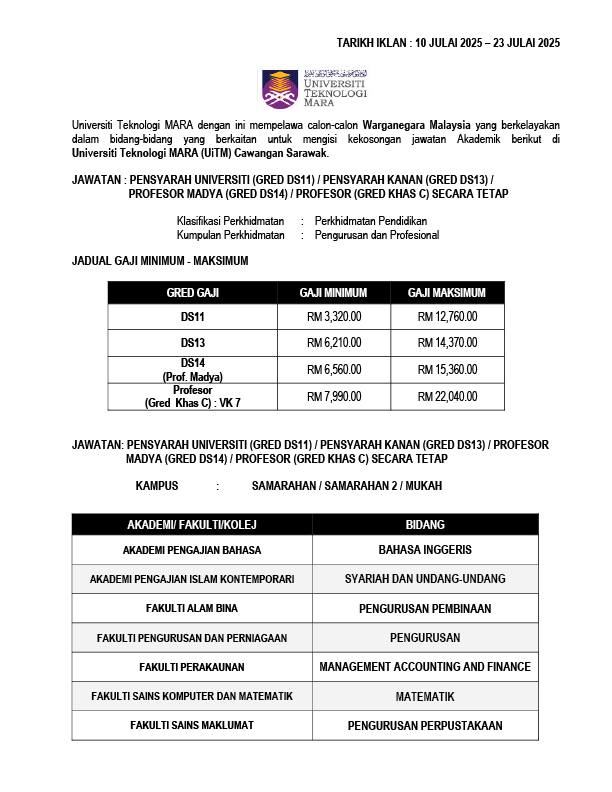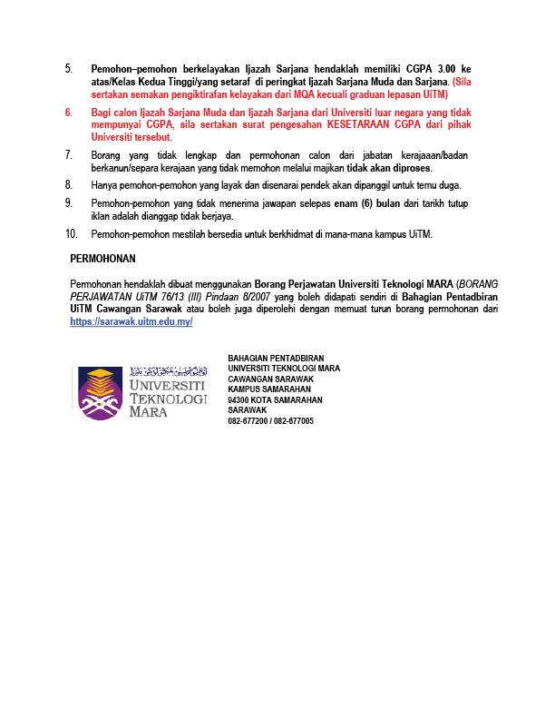Iklan Kini Jawatan Kosong Universiti Teknologi Mara (UiTM) Sarawak Like serta Ikut Facebook Kami, follow Chanel WhatsApp Jawatan Kosong & Telegram Portal SPA9 untuk capaian pantas kekosongan jawatan daripada kami sekarang. Klik Jawatan Disini