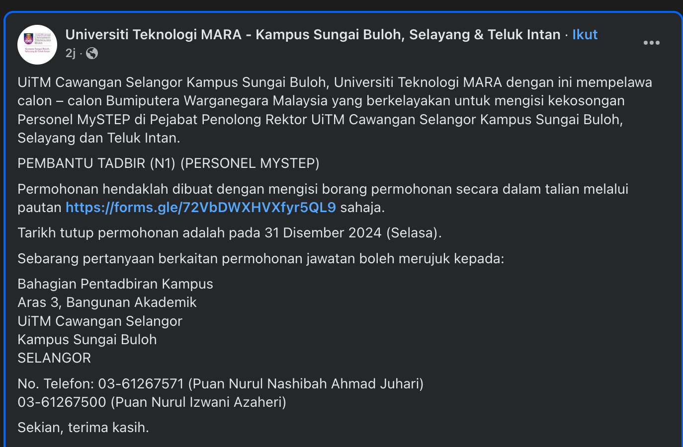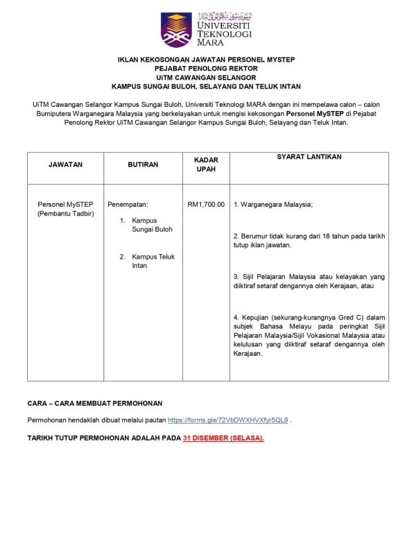 Iklan Kini Jawatan Kosong Universiti Teknologi MARA (UiTM) Like serta Ikut Facebook Kami, follow Chanel WhatsApp Jawatan Kosong & Telegram Portal SPA9 untuk capaian pantas kekosongan jawatan daripada kami sekarang. Klik Iklan Jawatan