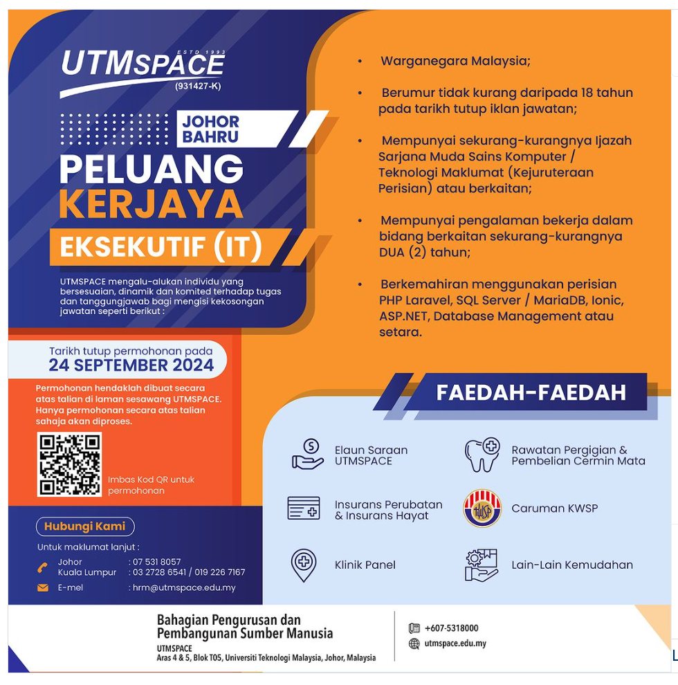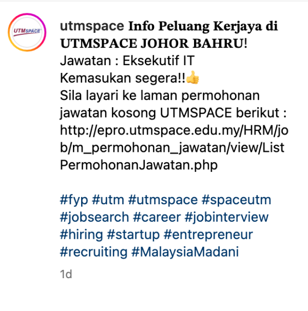 Iklan Kini Jawatan Kosong UTMSPACE Like serta Ikut Facebook Kami, follow Chanel WhatsApp Jawatan Kosong & Telegram Portal SPA9 untuk capaian pantas kekosongan jawatan daripada kami sekarang.