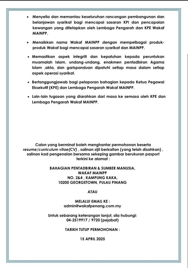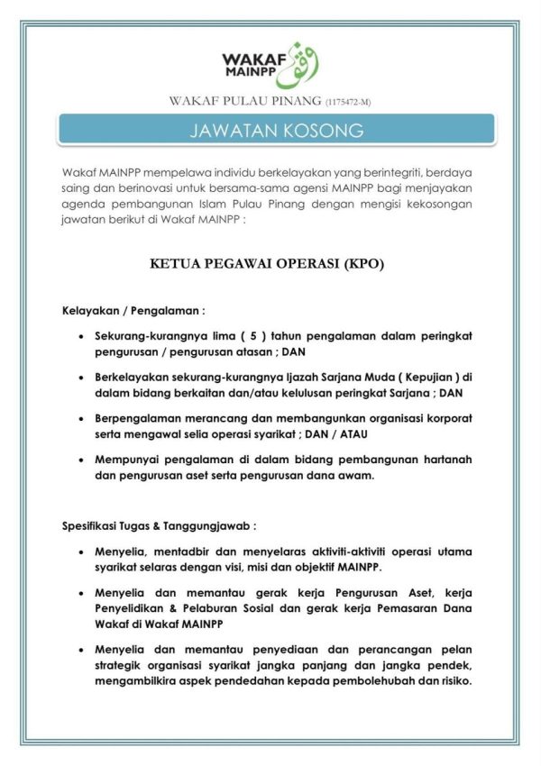 Iklan Kini Jawatan Kosong Wakaf Pulau Pinang Like serta Ikut Facebook Kami, follow Chanel WhatsApp Jawatan Kosong & Telegram Portal SPA9 untuk capaian pantas kekosongan jawatan daripada kami sekarang. Klik Jawatan Disini