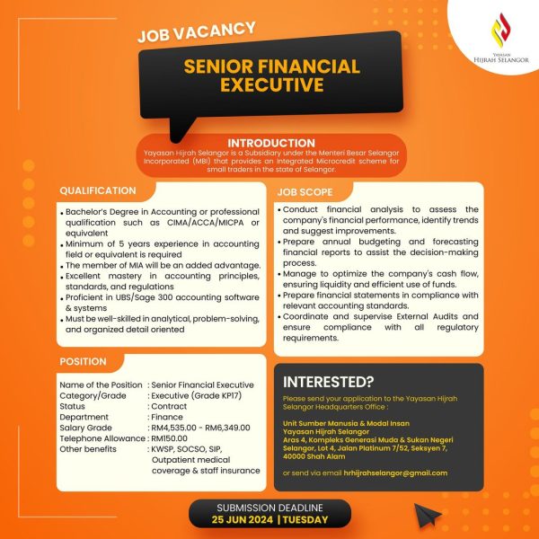 Yayasan Hijrah Selangor membuka peluang kepada individu yang berkelayakan untuk memohon jawatan kosong sebagai Senior Financial Executive (Gred KP17). Ini adalah peluang yang hebat untuk menjadi sebahagian daripada organisasi yang berdedikasi untuk pembangunan masyarakat.