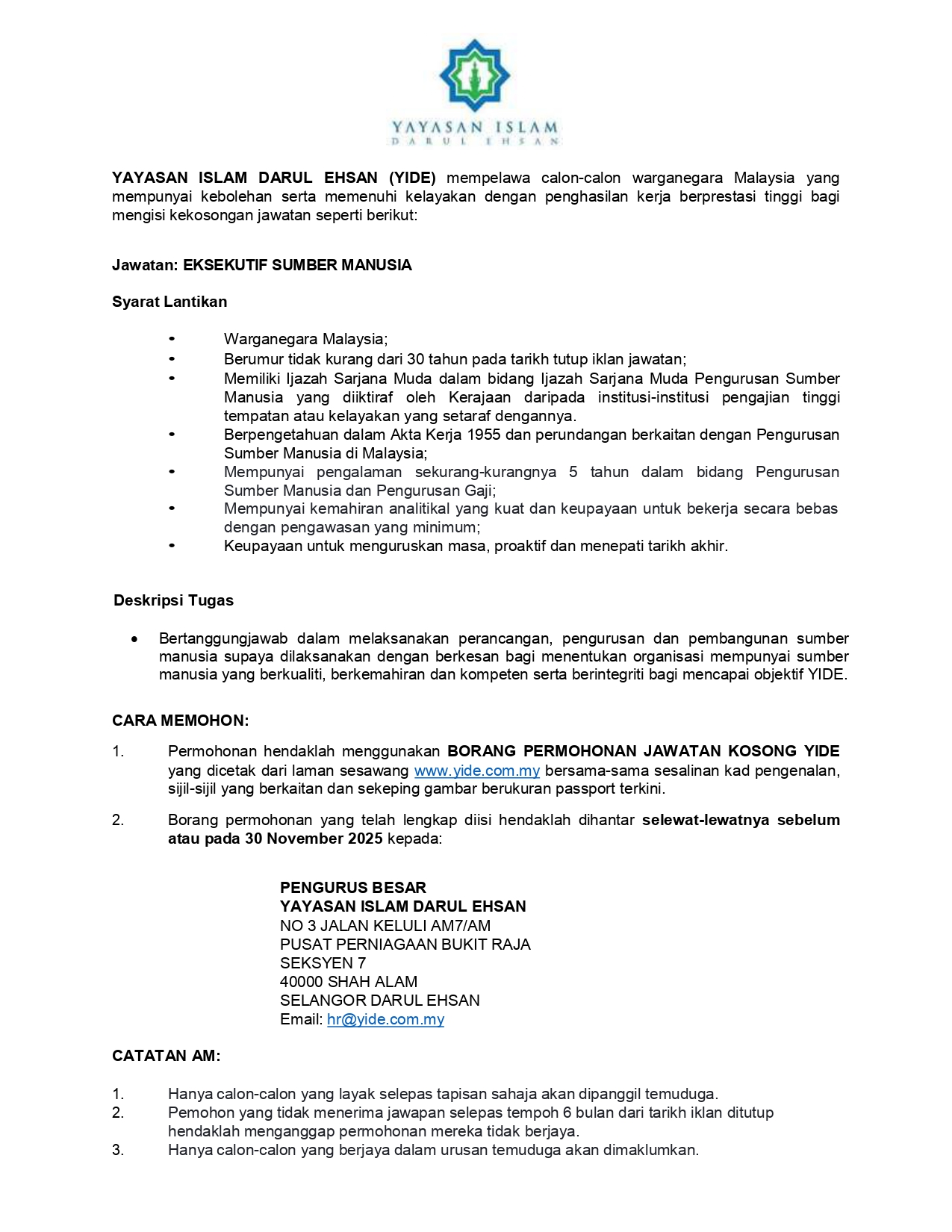 Iklan Kini Jawatan Kosong Yayasan Islam Darul Ehsan (YIDE) Like serta Ikut Facebook Kami, follow Chanel WhatsApp Jawatan Kosong & Telegram Portal SPA9 untuk capaian pantas kekosongan jawatan daripada kami sekarang. Klik Iklan Jawatan