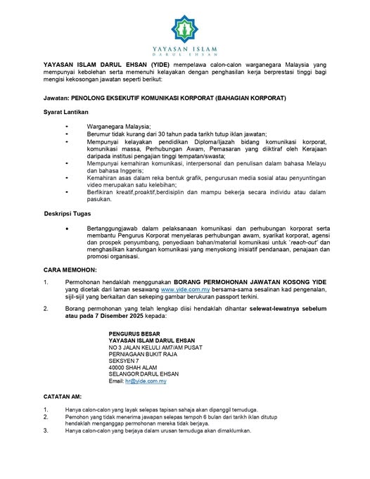 Iklan Kini Jawatan Kosong Yayasan Islam Darul Ehsan (YIDE) Like serta Ikut Facebook Kami, follow Chanel WhatsApp Jawatan Kosong & Telegram Portal SPA9 untuk capaian pantas kekosongan jawatan daripada kami sekarang. Iklan Jawatan
