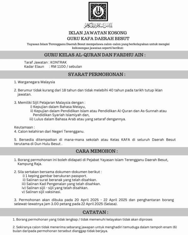 Iklan Kini Jawatan Kosong Yayasan Islam Terengganu Like serta Ikut Facebook Kami, follow Chanel WhatsApp Jawatan Kosong & Telegram Portal SPA9 untuk capaian pantas kekosongan jawatan daripada kami sekarang. Klik Jawatan Disini