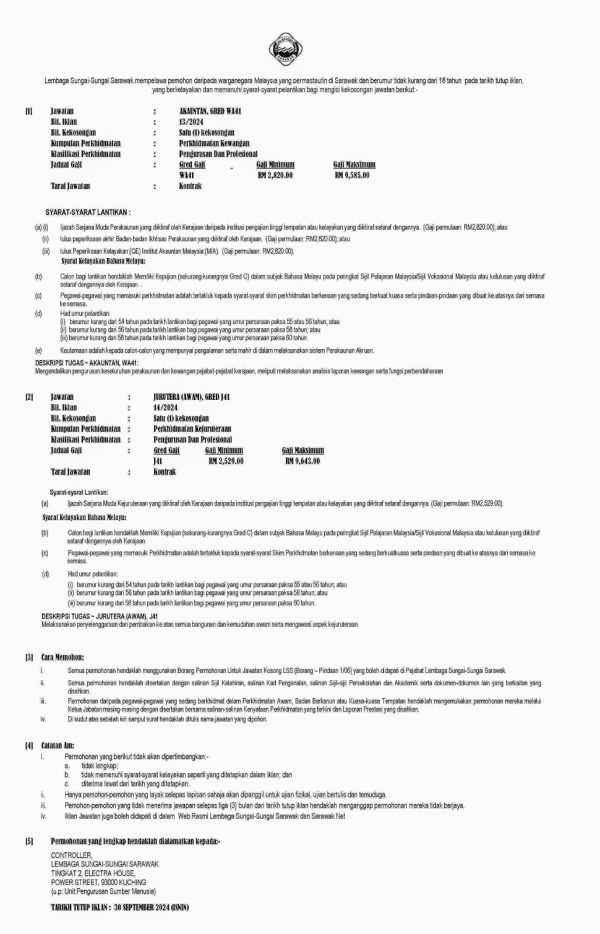 Iklan Kini Jawatan Lembaga Sungai-Sungai Sarawak Klik Jawatan Disini Like serta Ikut Facebook Kami, follow Chanel WhatsApp Jawatan Kosong & Telegram Portal SPA9 untuk capaian pantas kekosongan jawatan daripada kami sekarang.