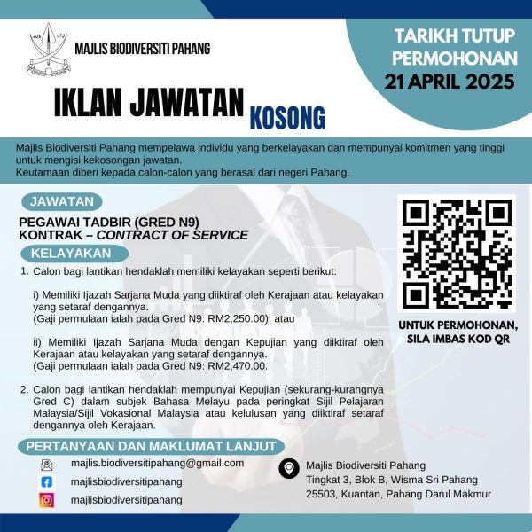 Iklan Kini Jawatan Majlis Biodiversiti Pahang Klik Jawatan Disini Like serta Ikut Facebook Kami, follow Chanel WhatsApp Jawatan Kosong & Telegram Portal SPA9 untuk capaian pantas kekosongan jawatan daripada kami sekarang.