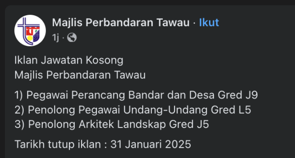 Iklan Kini Jawatan Majlis Perbandaran Tawau Like serta Ikut Facebook Kami, follow Chanel WhatsApp Jawatan Kosong & Telegram Portal SPA9 untuk capaian pantas kekosongan jawatan daripada kami sekarang. Klik Iklan Jawatan