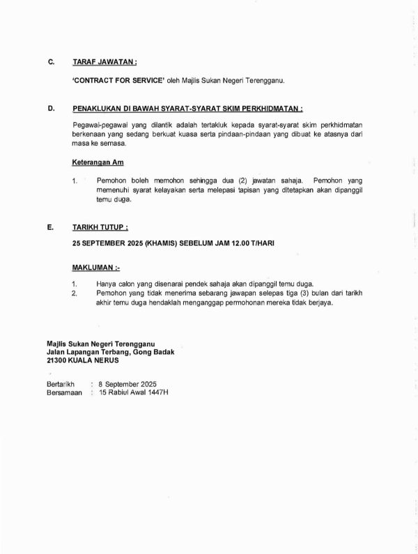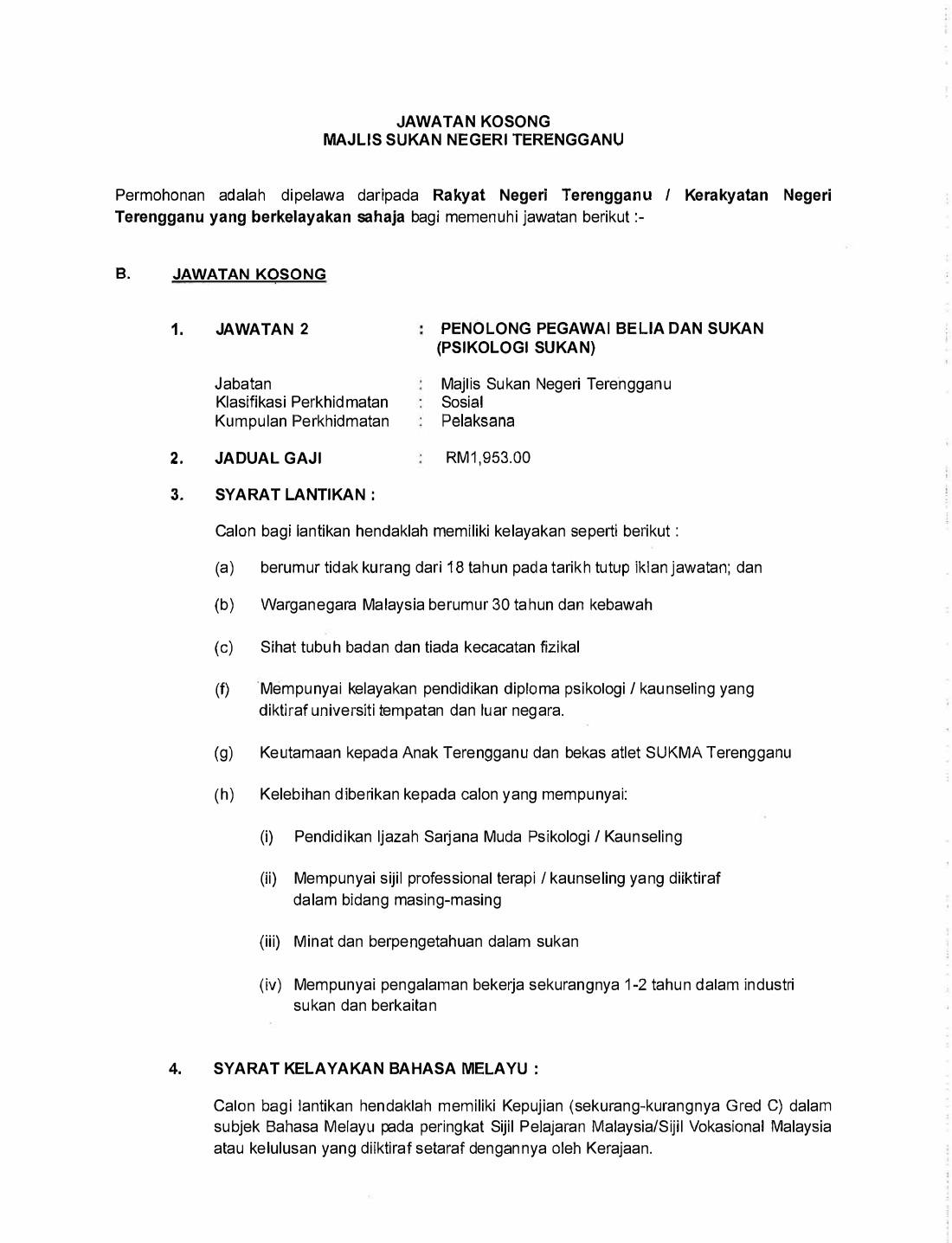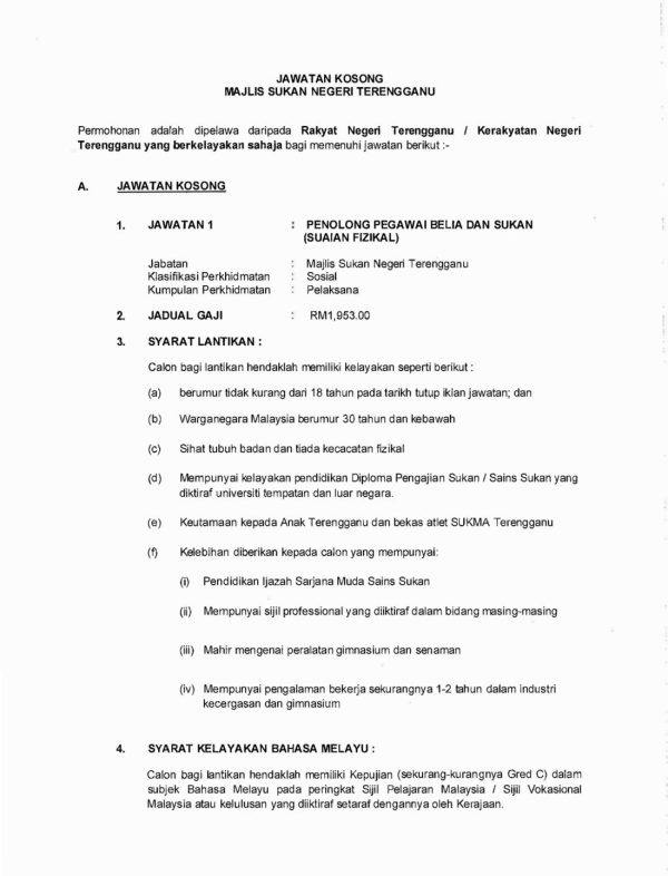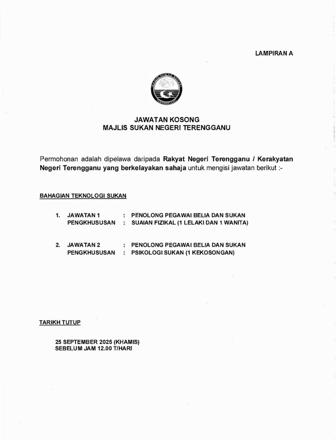 Iklan Kini Jawatan Majlis Sukan Negeri Terengganu Like serta Ikut Facebook Kami, follow Chanel WhatsApp Jawatan Kosong & Telegram Portal SPA9 untuk capaian pantas kekosongan jawatan daripada kami sekarang. Klik Iklan Disini