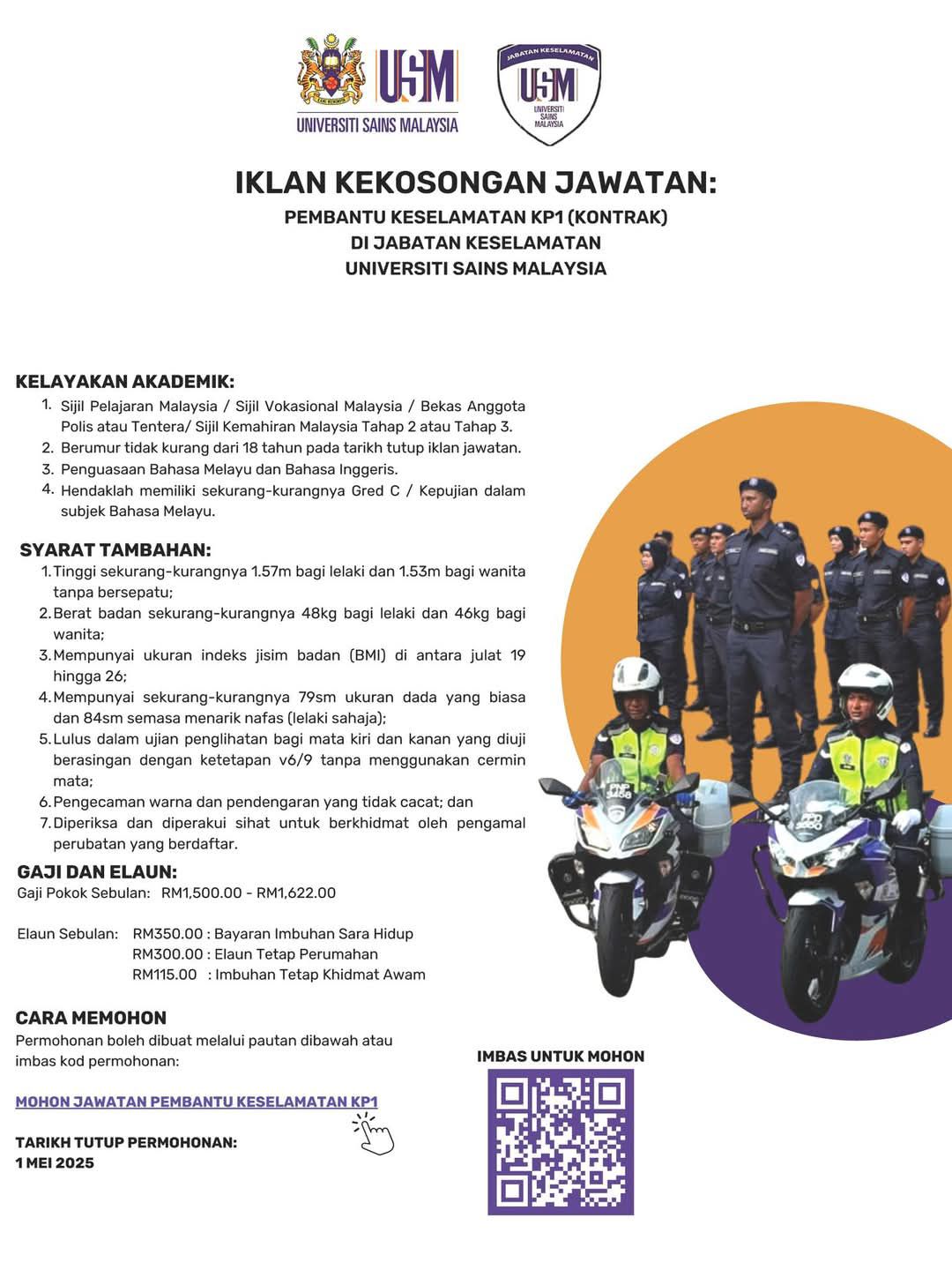 Iklan Kini Jawatan Pembantu Keselamatan KP1 (Kontrak) Di Jabatan Keselamatan Universiti Sains Malaysia