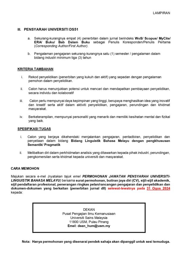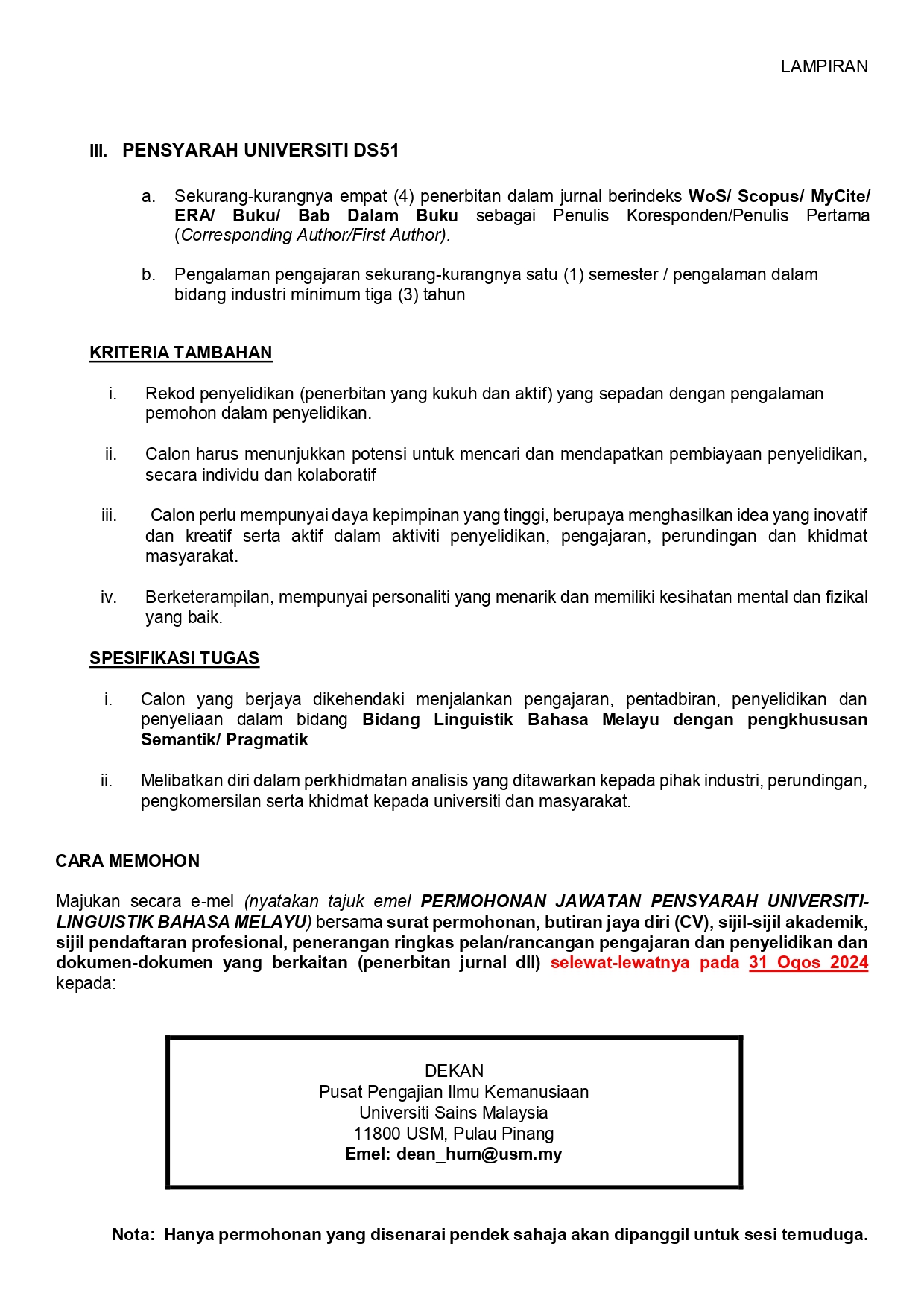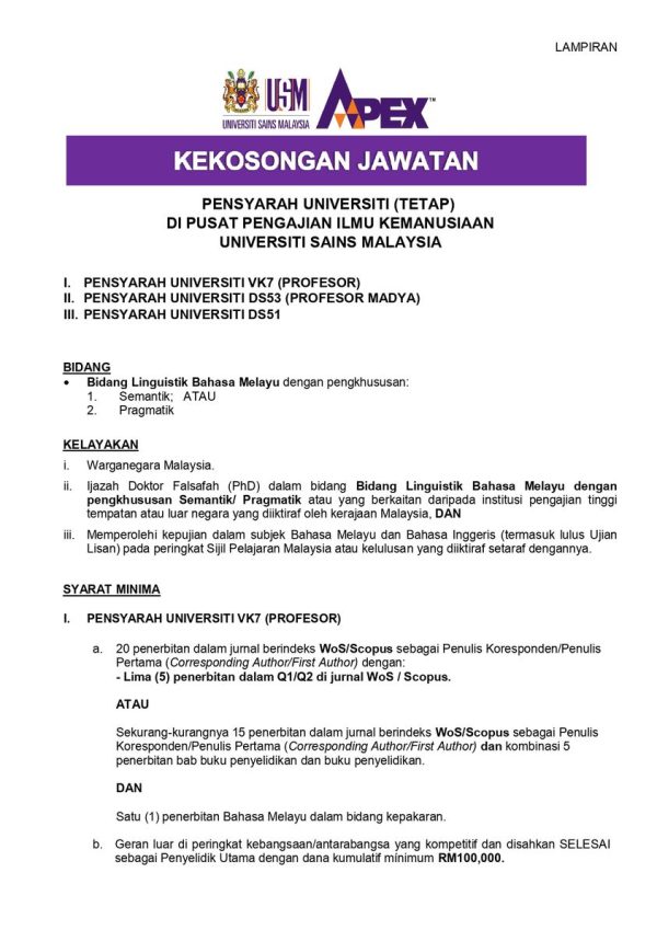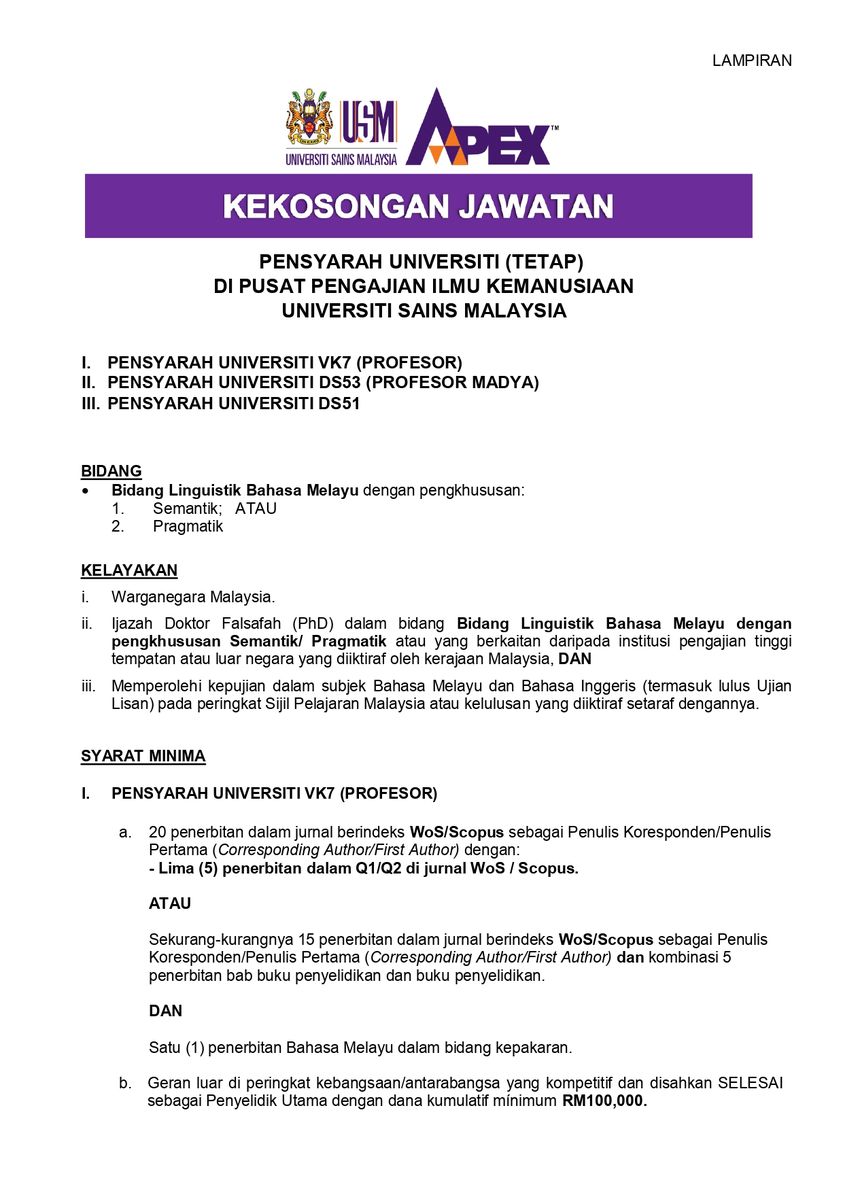 Iklan Kini Jawatan Pensyarah Universiti (Tetap) USM Like serta Ikut Facebook Kami, follow Chanel WhatsApp Jawatan Kosong & Telegram Portal SPA9 untuk capaian pantas kekosongan jawatan daripada kami sekarang. Klik Jawatan Disini