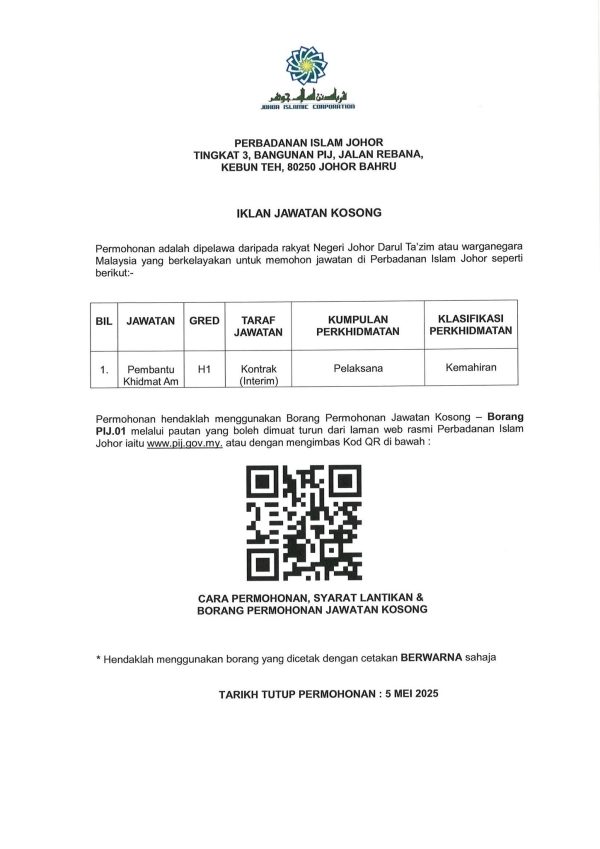 Iklan Kini Jawatan Perbadanan Islam Johor Klik Jawatan Disini Like serta Ikut Facebook Kami, follow Chanel WhatsApp Jawatan Kosong & Telegram Portal SPA9 untuk capaian pantas kekosongan jawatan daripada kami sekarang.