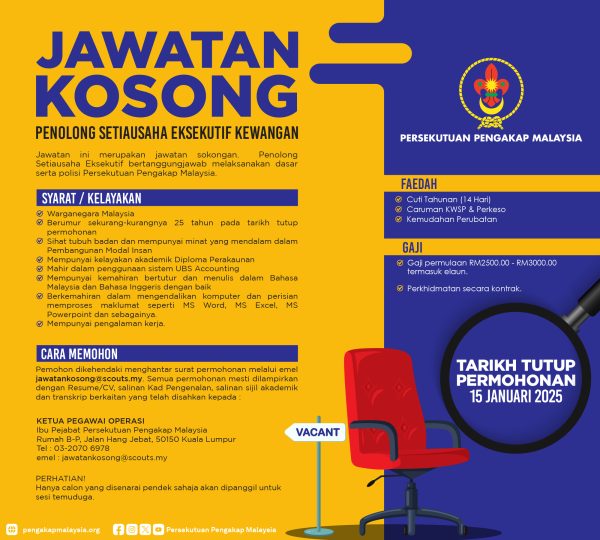Iklan Kini Jawatan Persekutuan Pengakap Malaysia Klik Iklan Jawatan Like serta Ikut Facebook Kami, follow Chanel WhatsApp Jawatan Kosong & Telegram Portal SPA9 untuk capaian pantas kekosongan jawatan daripada kami sekarang.