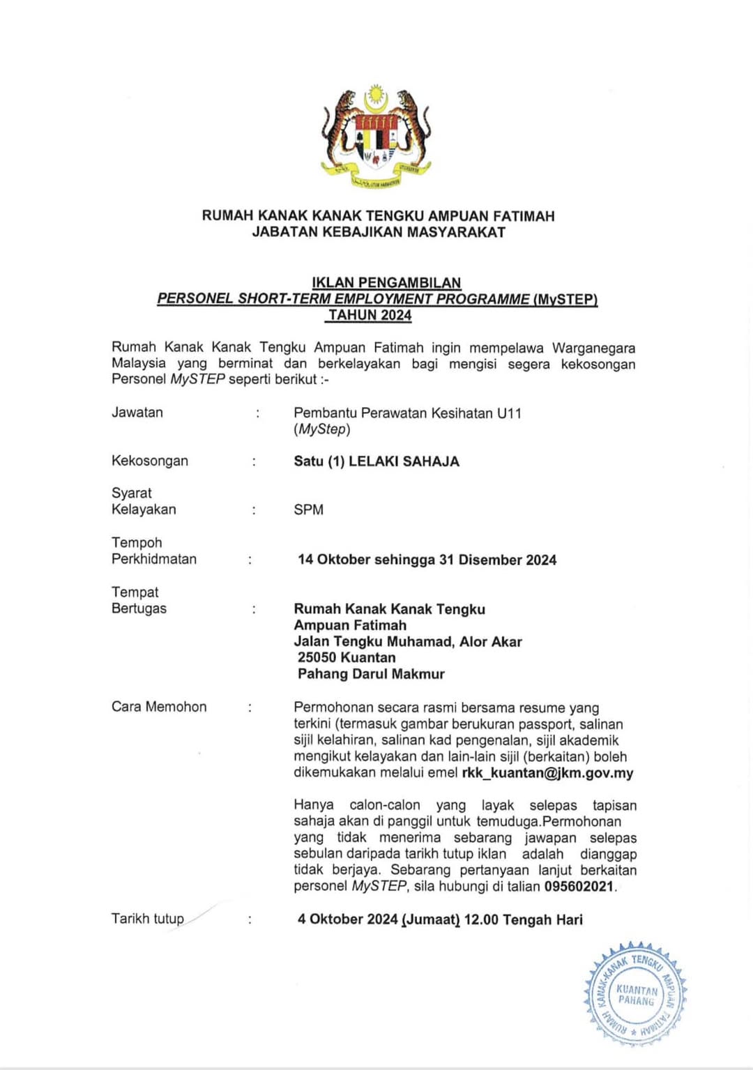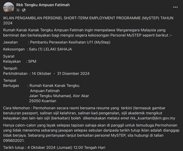 Iklan Kini Jawatan Rumah Kanak Kanak Tengku Ampuan Fatimah Klik Jawatan Disini Like serta Ikut Facebook Kami, follow Chanel WhatsApp Jawatan Kosong & Telegram Portal SPA9 untuk capaian pantas kekosongan jawatan daripada kami sekarang.