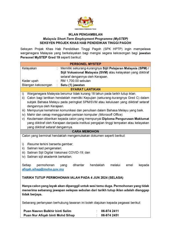 Seksyen Projek Khas Hab Pendidikan Tinggi Pagoh (SPK HPTP) membuka peluang pekerjaan yang menarik bagi individu yang berminat dan berkelayakan untuk menyertai sebagai Personel MySTEP. Ini adalah kesempatan untuk menjadi sebahagian daripada inisiatif yang dinamik dan inovatif dalam bidang pendidikan tinggi.