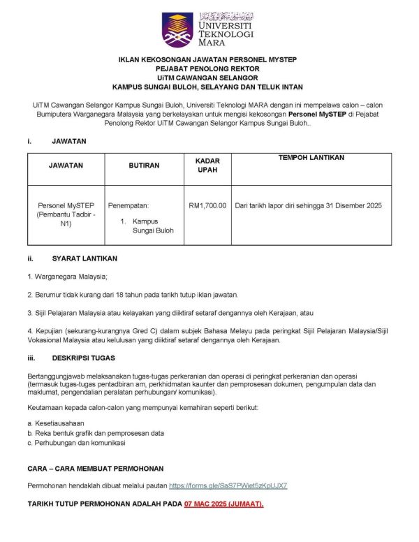 Iklan Kini Jawatan UiTM Cawangan Selangor Like serta Ikut Facebook Kami, follow Chanel WhatsApp Jawatan Kosong & Telegram Portal SPA9 untuk capaian pantas kekosongan jawatan daripada kami sekarang. Klik Jawatan Disini
