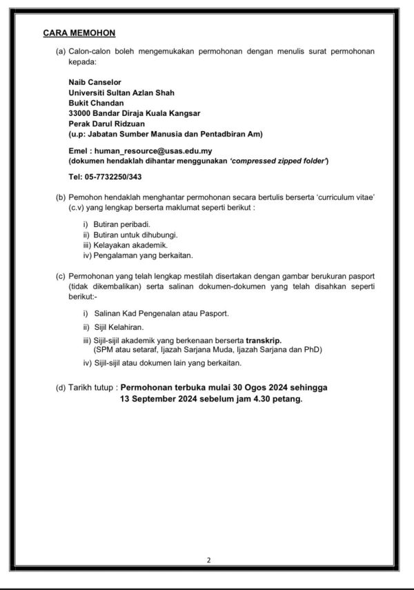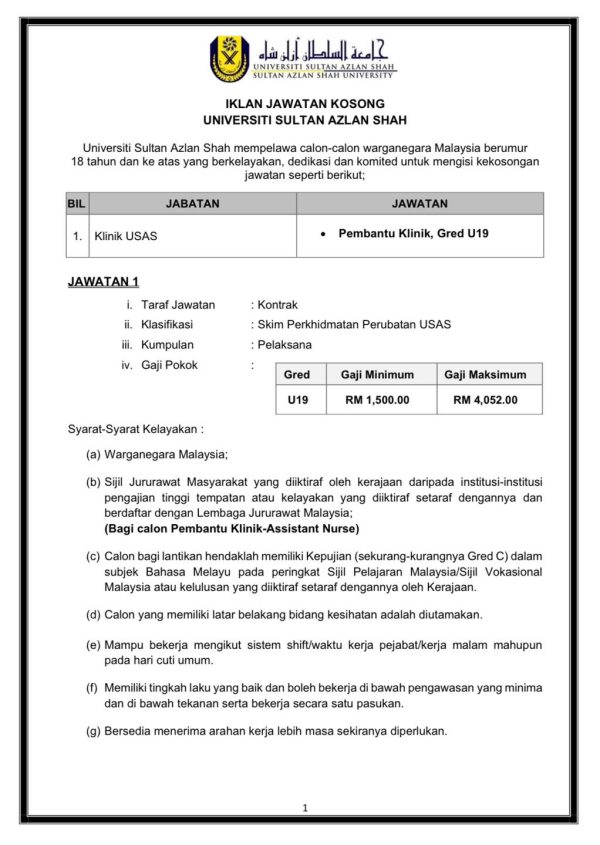 Iklan Kini Jawatan Universiti Sultan Azlan Shah (USAS) Like serta Ikut Facebook Kami, follow Chanel WhatsApp Jawatan Kosong & Telegram Portal SPA9 untuk capaian pantas kekosongan jawatan daripada kami sekarang.