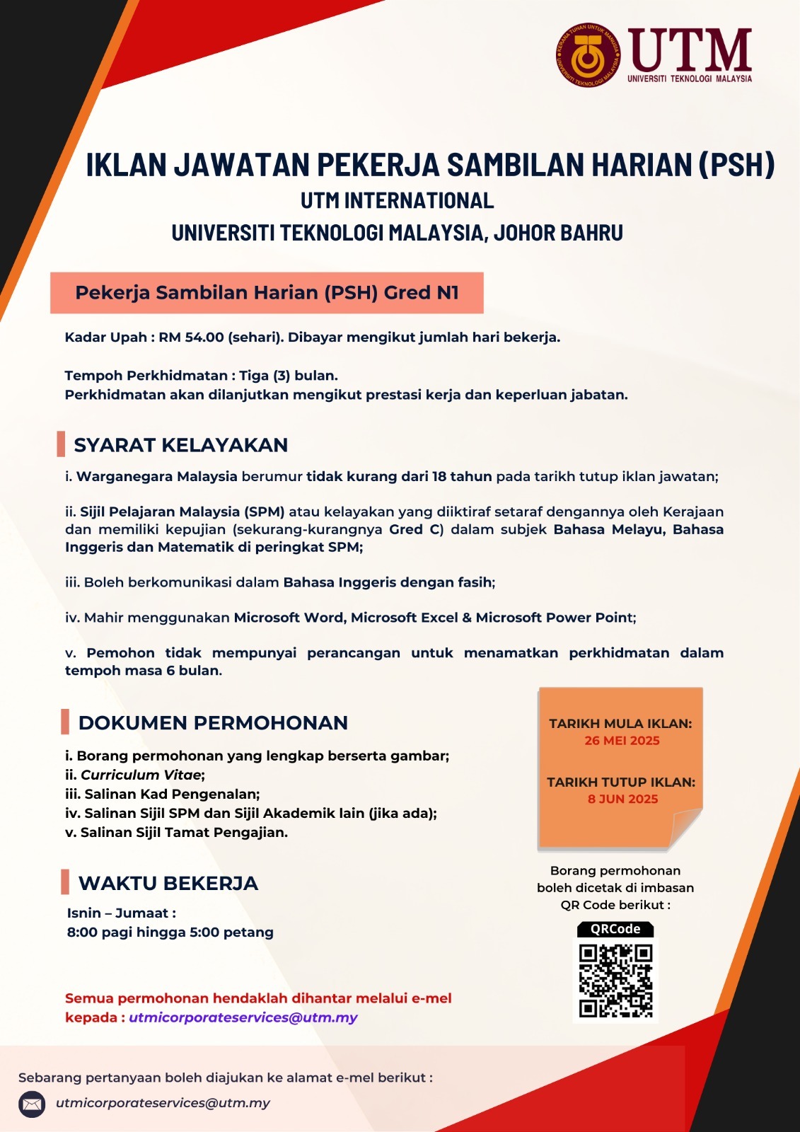 Iklan Kini Jawatan Universiti Teknologi Malaysia (UTM) Like serta Ikut Facebook Kami, follow Chanel WhatsApp Jawatan Kosong & Telegram Portal SPA9 untuk capaian pantas kekosongan jawatan daripada kami sekarang. Klik Jawatan Disini