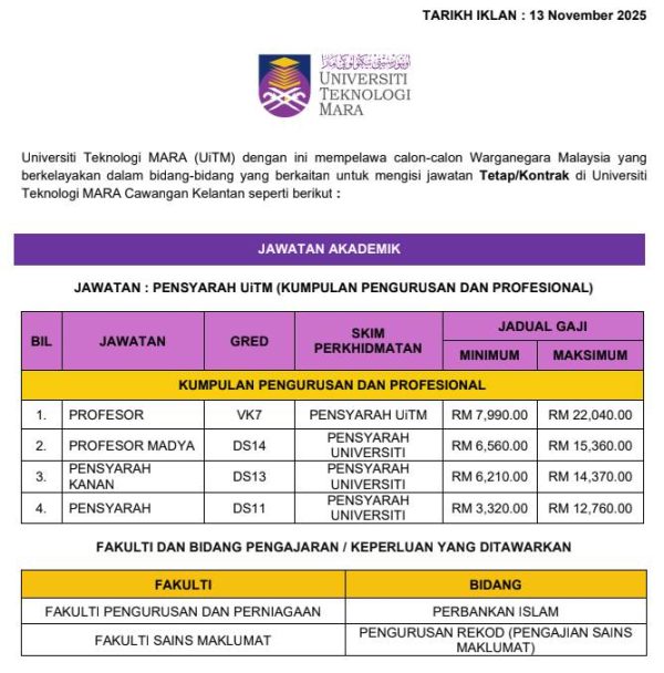 Iklan Kini Jawatan Universiti Teknologi MARA (UiTM) Cawangan Kelantan Like serta Ikut Facebook Kami, follow Chanel WhatsApp Jawatan Kosong & Telegram Portal SPA9 untuk capaian pantas kekosongan jawatan daripada kami sekarang. Klik Iklan Jawatan