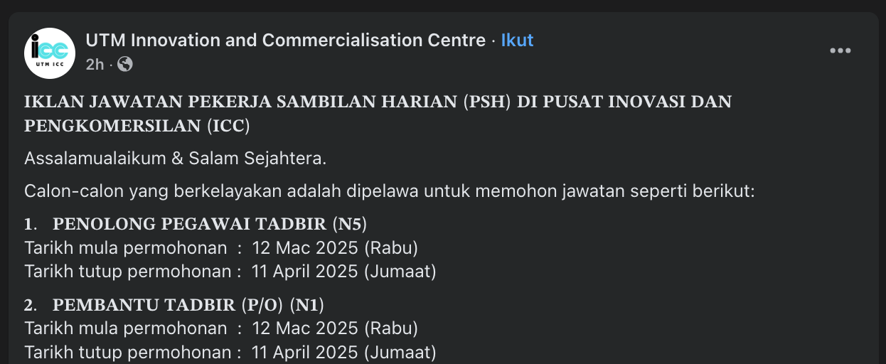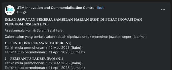 Iklan Kini Jawatan UTM Innovation and Commercialisation Centre Like serta Ikut Facebook Kami, follow Chanel WhatsApp Jawatan Kosong & Telegram Portal SPA9 untuk capaian pantas kekosongan jawatan daripada kami sekarang. Klik Jawatan Disini