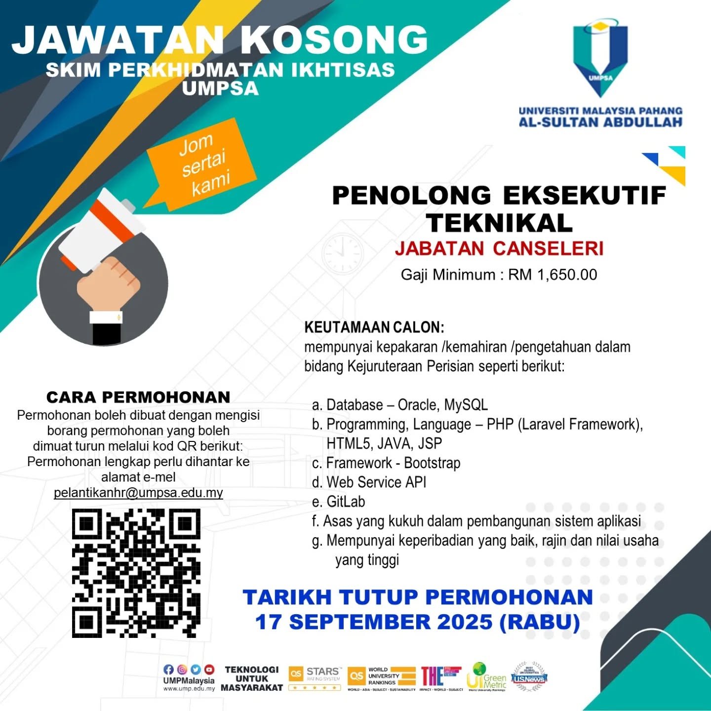 Iklan Kini Kekosongan Jawatan Universiti Malaysia Pahang Klik Iklan Disini Like serta Ikut Facebook Kami, follow Chanel WhatsApp Jawatan Kosong & Telegram Portal SPA9 untuk capaian pantas kekosongan jawatan daripada kami sekarang.