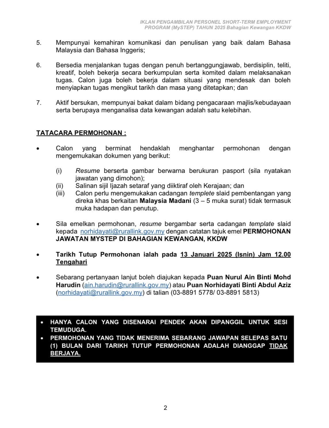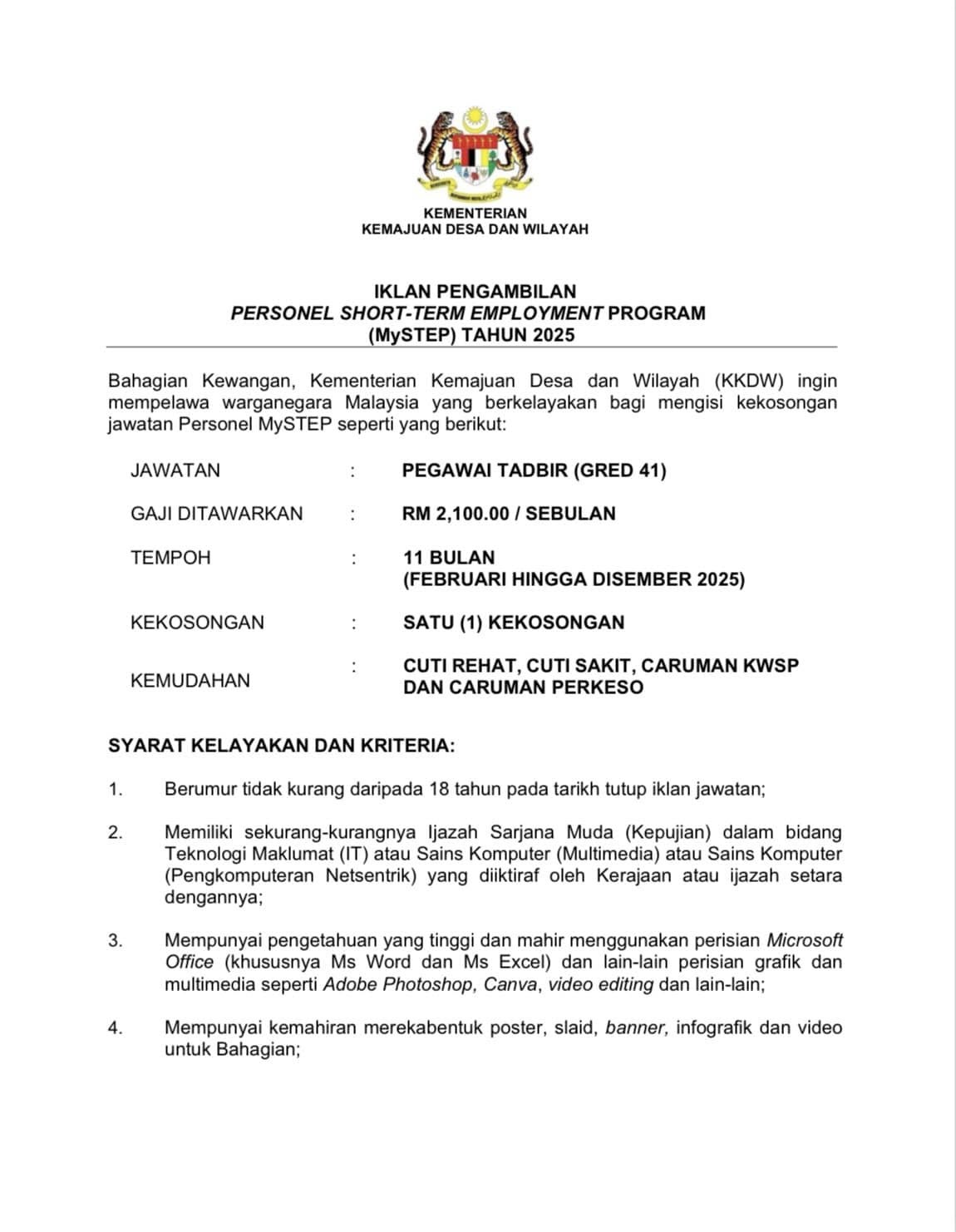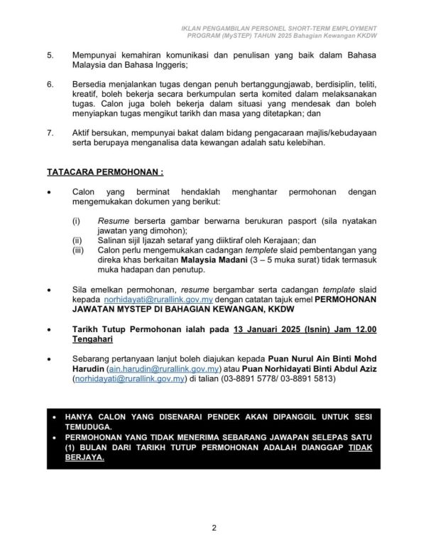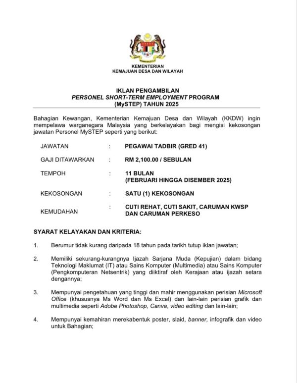 Iklan Kini Kementerian Kemajuan Desa dan Wilayah (KKDW) Like serta Ikut Facebook Kami, follow Chanel WhatsApp Jawatan Kosong & Telegram Portal SPA9 untuk capaian pantas kekosongan jawatan daripada kami sekarang. Klik Iklan Jawatan